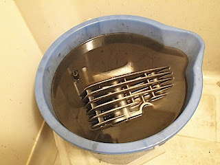 はずしたヘッドはお風呂の片隅で、洗浄液に浸かってもらいます。