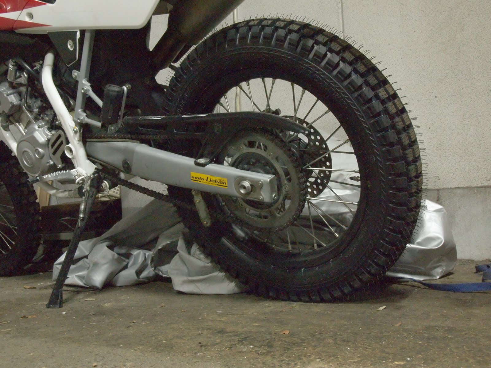 セローやXR230なんかにこのタイヤ履くにはスイングアームに干渉するので少し削ったり、チェーンのコマ数増やしたりFスプロケ1丁落としなんかが必要だそうです。TE125はもともと山が13mmのエンデュロータイヤ履いてましたのでスイングアームに干渉する事無くポン付け。チェーンコマ数も純正ままでOKです。Fスプロケは1丁落とした方がイイかもしれません。