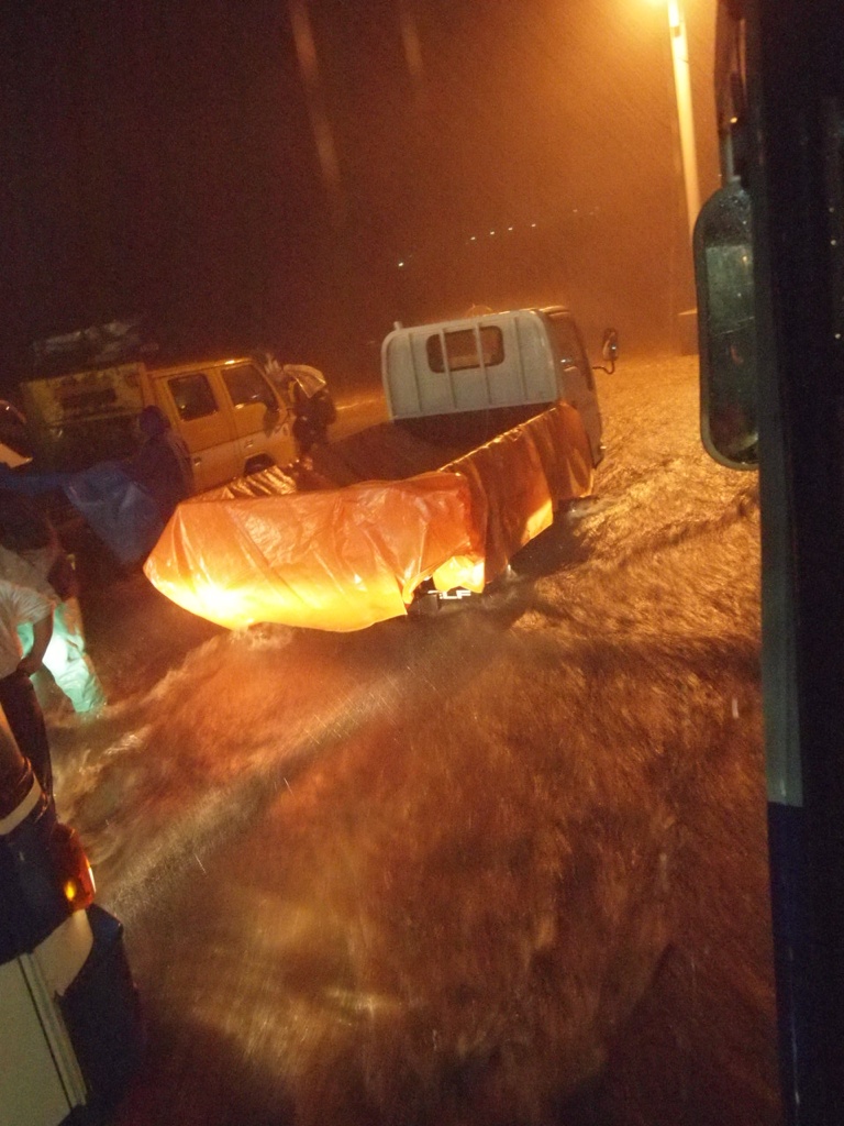 これに乗って、宿にチェックインし、1時間ほど仮眠をとります。天候が回復することを祈って。この時点ではレース開催そのものが危ぶまれるほどの降雨でした。