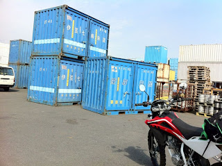 前週の土日に、辰巳埠頭にて東海汽船にバイクを預けます。レース参加者、ツアー参加者の分をコンテナに積み込み、まとめてフェリーで運ぶためです。コンテナは島ではピット替わりにもなります。レース参加者は、車両以外にも、工具やガソリンなどボックス一箱分の荷物もいっしょに詰めます。体験ツアー参加者は基本的には車両のみの積み込みです。サイドケースつきR-GSもいたのですが、ここに荷物を積めるのは羨ましかったですね。なぜなら、レース参加者も含めて、基本的に装備一式は手荷物で舟に乗ることになるからです。