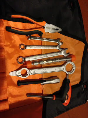 付属工具はなんか立派です。真ん中のなんて、裏返して使うことで、32mm、27mm、21mm、17mmが1本で使えますし、タイヤレバーもついてます。FREERIDE350のアクスルは前17mm、後27mmですけどね。