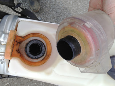 今回、カートリッジの底の部分、差し込むゴム部分のリップ、穴の底面のタンクの部分などにうっすらをグリスを塗っておいたら、このへんにしっかりとホコリが付着してました。林道ツーリング程度でこんな感じですよ。グリスがなければ、この分は隙間から吸ってるはずです。
